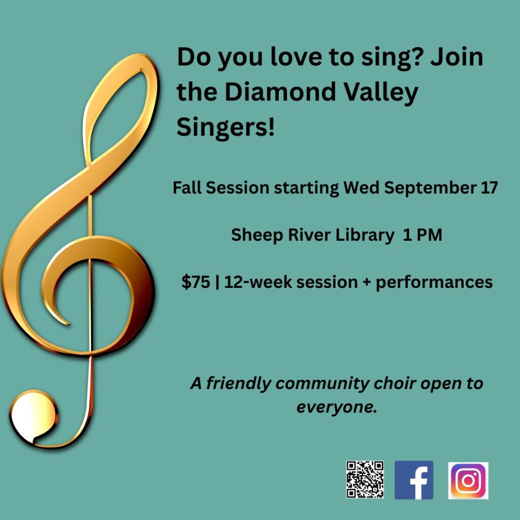 Love to sing? The Diamond Valley Singers invite you to join their Fall Session starting Wednesday, September 17 at 1:00 PM at the Sheep River Library.
