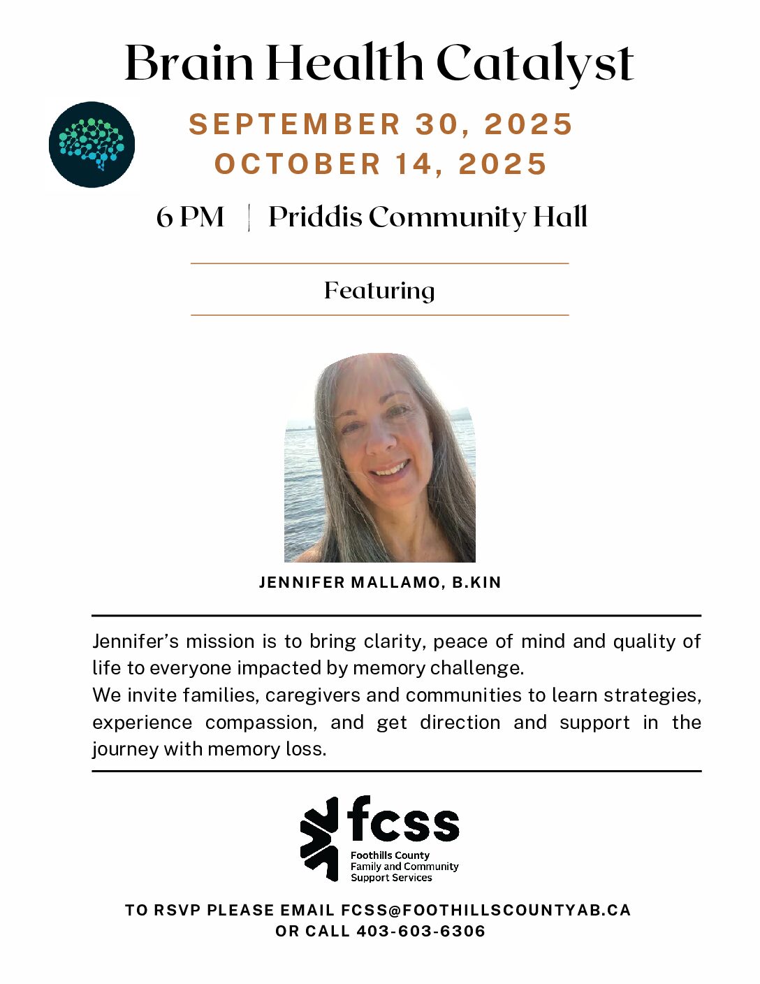 Please join us for this free opportunity to learn about how memory works, strategies for supporting aging in place, and how to take responsibility for your own brain health. Register for 1 or both sessions - different topics each session. Priddis Community Hall 6:00 - 7:30 pm Sept 30 and Oct 14 Register: fcss@foothillscountyab.ca or […] |