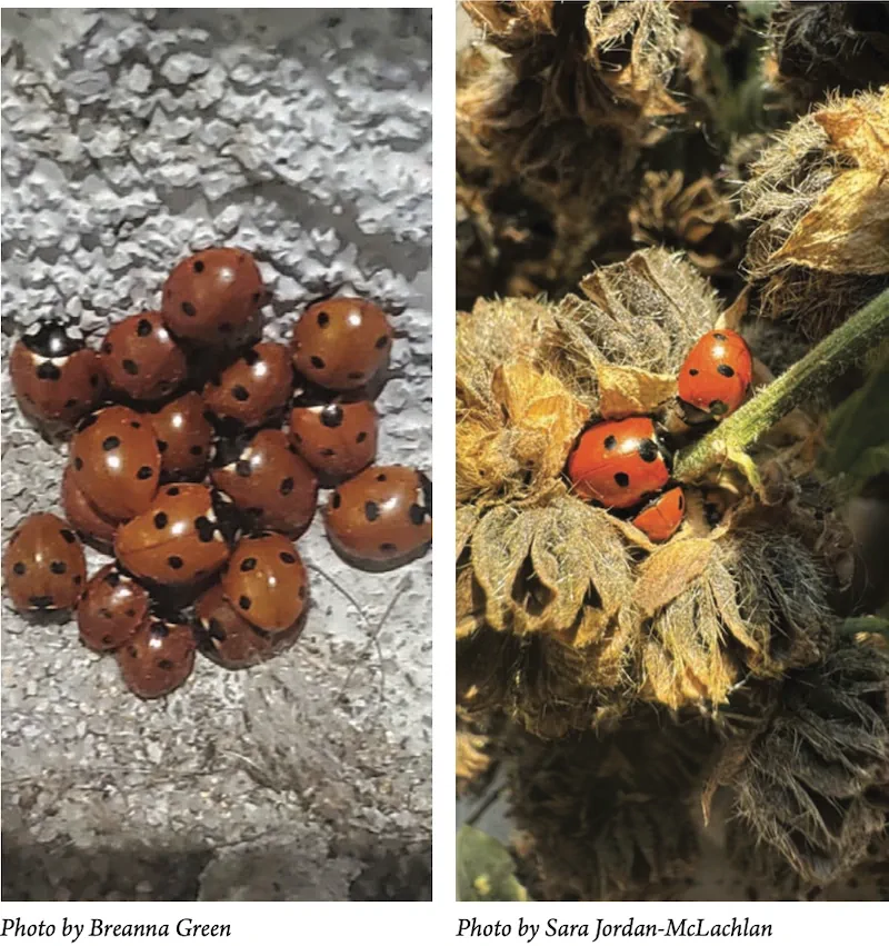 Another thought to the benefit of gathering together is to make the ladybugs less vulnerable to predators when they are in diapause. Diapause is the insect form of hibernation, a state where your metabolism reduces, the processes in your body can slow down or stop and you try to conserve as much energy as possible. This means no movement for up to 9 months. And no movement for something as small as a ladybeetle means they could easily become a predator’s snack. One hypothesis is that by gathering together the ladybeetles turn their small individual aposematic warning into a giant warning sign for predators to keep away.