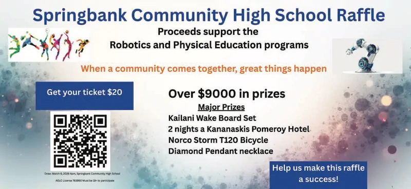 Springbank Community High School will be holding a raffle to support their Robotics and Physical Education programs! Attached is a QR code that can be scanned to purchase tickets.