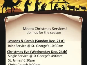 Please join us for the Season! Christmas Services in Meota Parish are as follows: Lessons and Carols Sunday Dec 21 Joint at St George’s Diamond Valley...